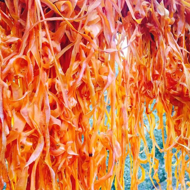 ,红灿灿的颜色从地上一直铺到了天边,阳光透过柿子映照出了别样的灿烂,饱满而朴实。据后来了解到,制作柿饼选材严格,要求选果大、果形端正、果顶平或稍突起、无纵沟、含糖量高、含水量适中、无核或少核的品种。再经削皮、脱涩、软化、晾晒捏型、出霜等十多道工序手工精细制作,历时一个多月时间,方能“酿”成美味的柿饼。